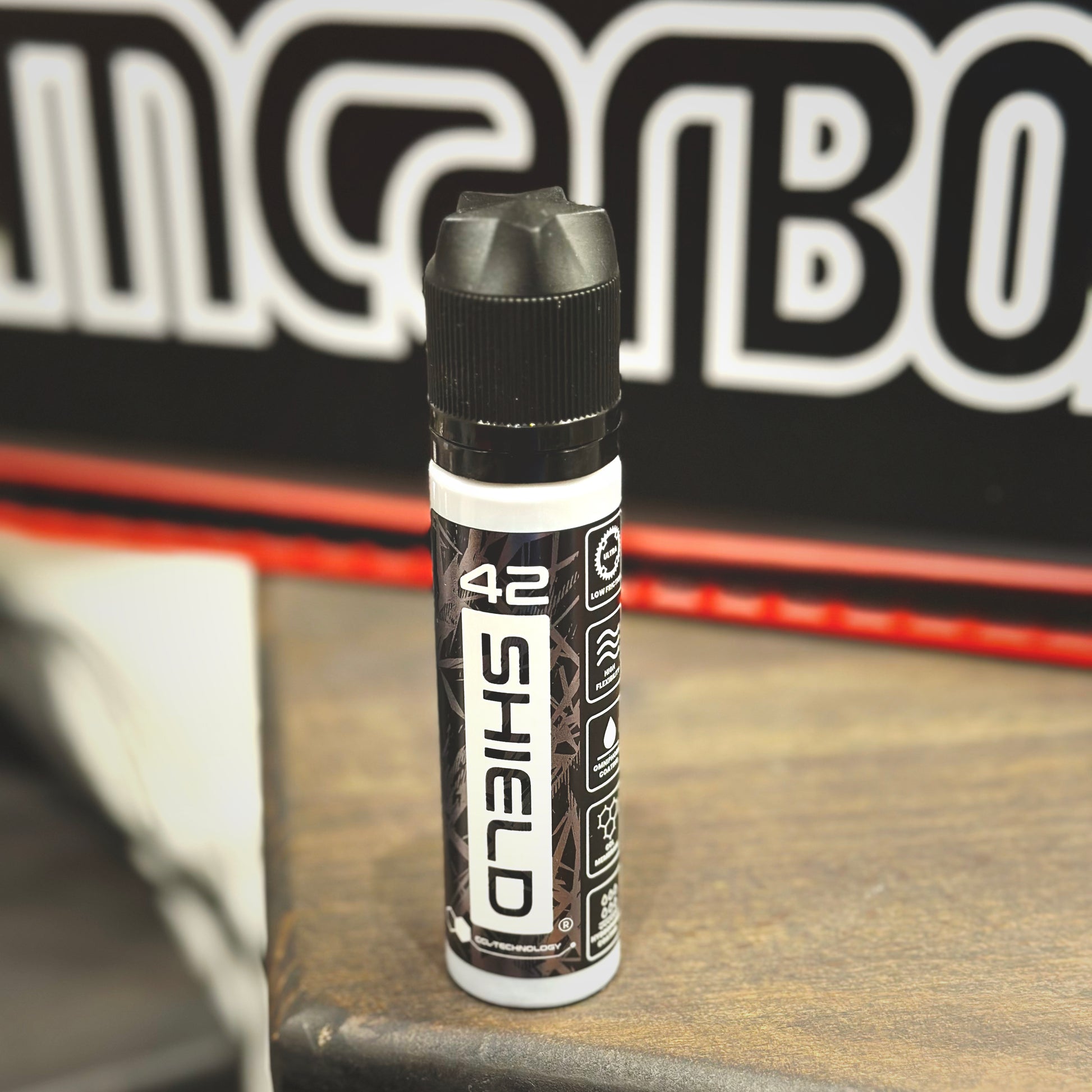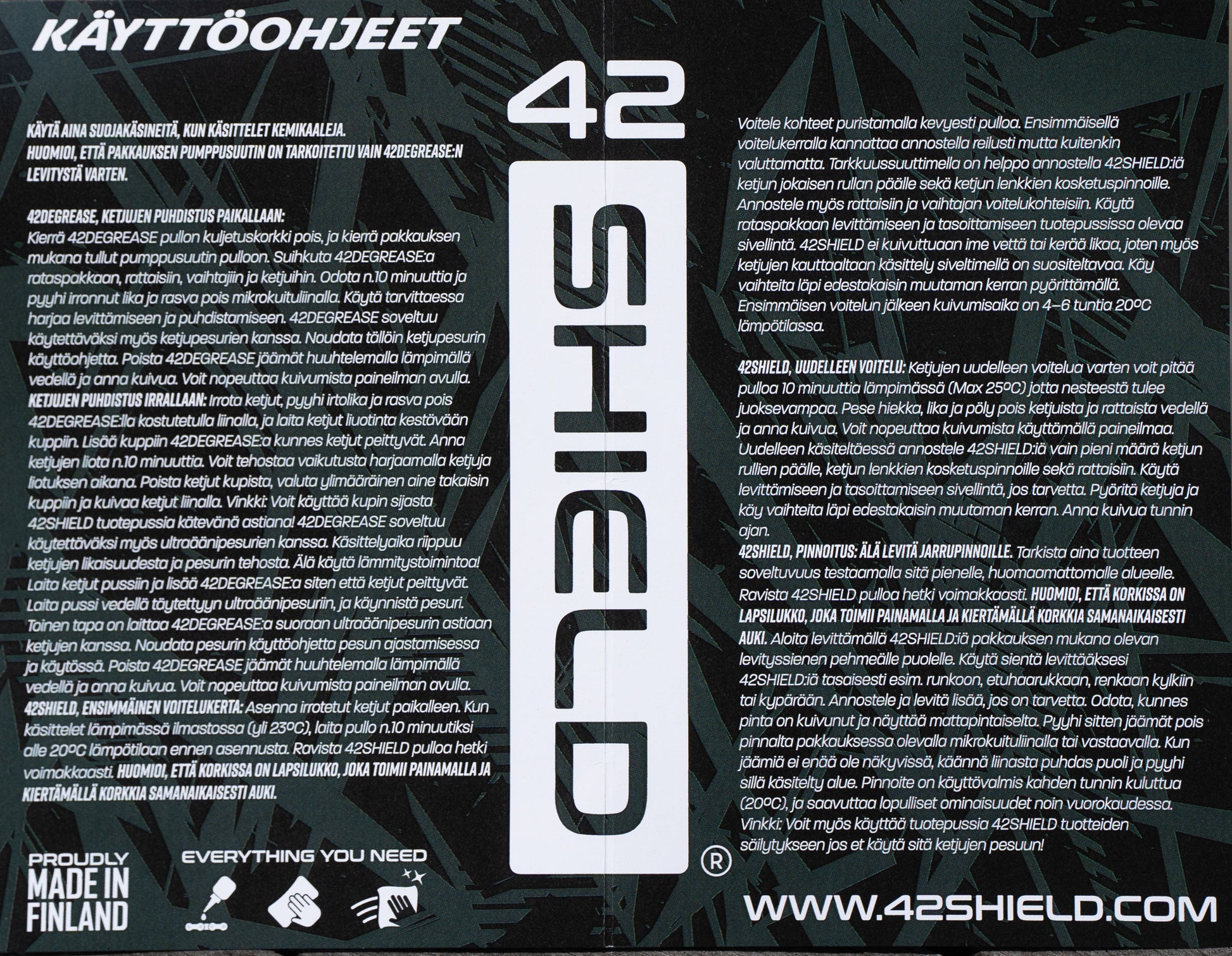 42SHIELD on suomalaiseen CCL (Carbon Carbon Lubrication) -teknologiaan perustuva monikäyttöinen pinnoittava voiteluaine käytettäväksi polkupyörissä ja sähköpyörissä. Se korvaa useita yhden toiminnallisuuden kemikaaleja yhdellä helppokäyttöisellä ja kustannustehokkaalla tuotteella.