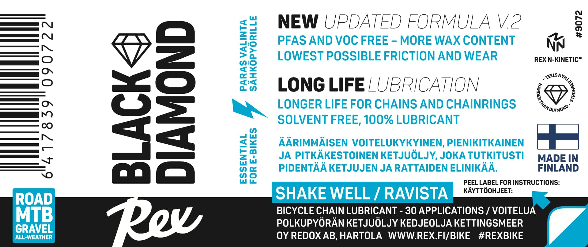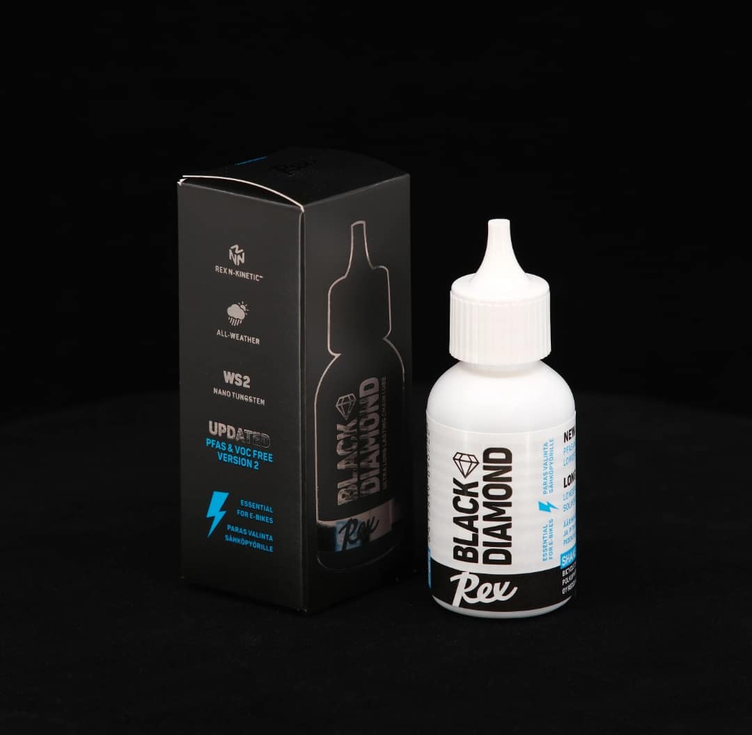 Mahdollisimman pienen kitkan saavuttaminen ketjuöljyssä on aiemmin vaatinut säänkeston uhraamista. Myös niin sanotut “wet lube” -ketjuöljyt ovat ennen olleet paljon energiaa ryöstäviä ja likaa kerääviä. Rex Black Diamondissa yhdistyy maailmanluokan voitelukyky vahvaan säänkestoon ennennäkemättömällä tavalla. Testattu menestyksekkäästi vaativissa kisaolosuhteissa maastossa ja maantiellä!